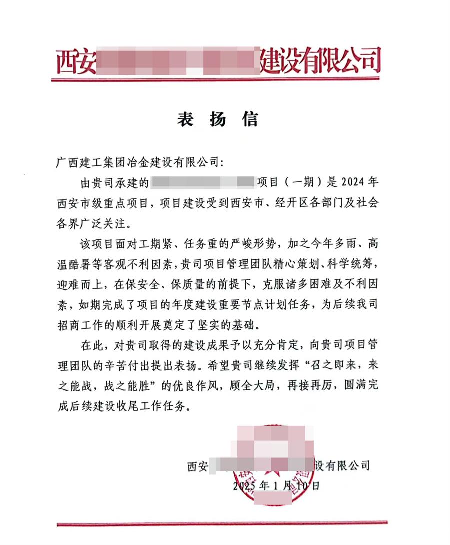 【喜訊】冶建公司收到項(xiàng)目業(yè)主表揚(yáng)信