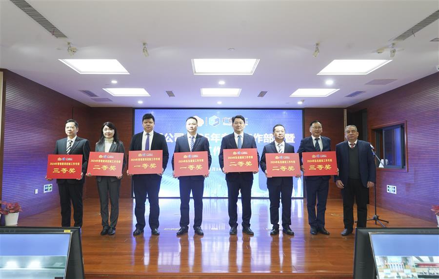 公司董事長(zhǎng)、黨委書記覃振華(右三)上臺(tái)領(lǐng)取2024年隊(duì)伍建設(shè)工作專班獎(jiǎng),公司總經(jīng)理、黨委副書記蒙勝益(左一)上臺(tái)領(lǐng)取2024年管理費(fèi)用控制工作專班獎(jiǎng)