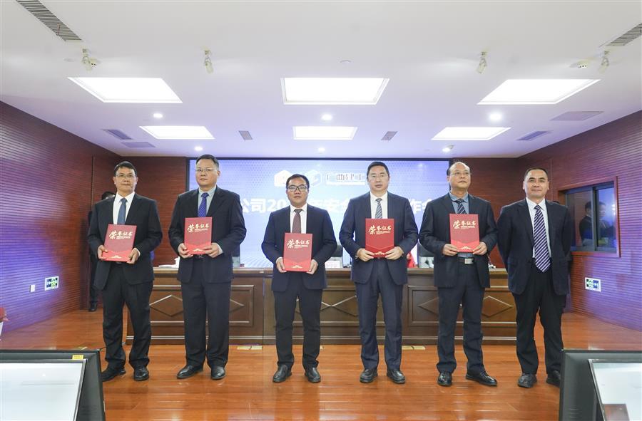 公司董事長(zhǎng)、黨委書記覃振華(右三)上臺(tái)領(lǐng)取優(yōu)秀經(jīng)營(yíng)單位獎(jiǎng)