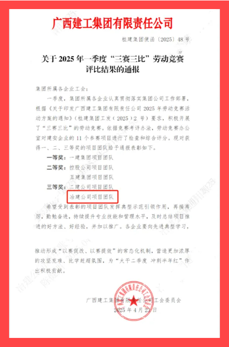 4月23日,集團(tuán)公司工會通報(bào)2025年一季度“三賽三比”勞動競賽評比結(jié)果,冶建公司項(xiàng)目團(tuán)隊(duì)在11個(gè)建安企業(yè)參賽項(xiàng)目中榮獲三等獎(jiǎng),彰顯了項(xiàng)目團(tuán)隊(duì)務(wù)實(shí)高效、團(tuán)結(jié)協(xié)作、拼搏進(jìn)取的精神風(fēng)貌。