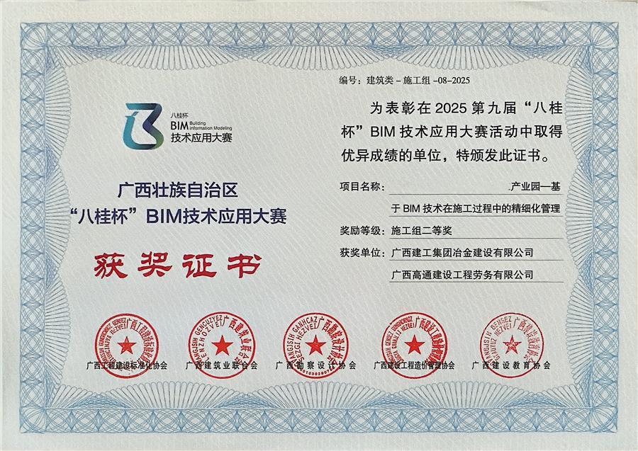 3月20日,2026年全區(qū)建筑信息模型(BIM)應(yīng)用交流會(huì)暨第九屆“八桂杯”BIM技術(shù)應(yīng)用大賽頒獎(jiǎng)在柳州舉行。冶建公司基礎(chǔ)分公司申報(bào)的一課題,憑借出色的BIM技術(shù)應(yīng)用水平與管理成效,榮獲施工組建筑類二等獎(jiǎng)。