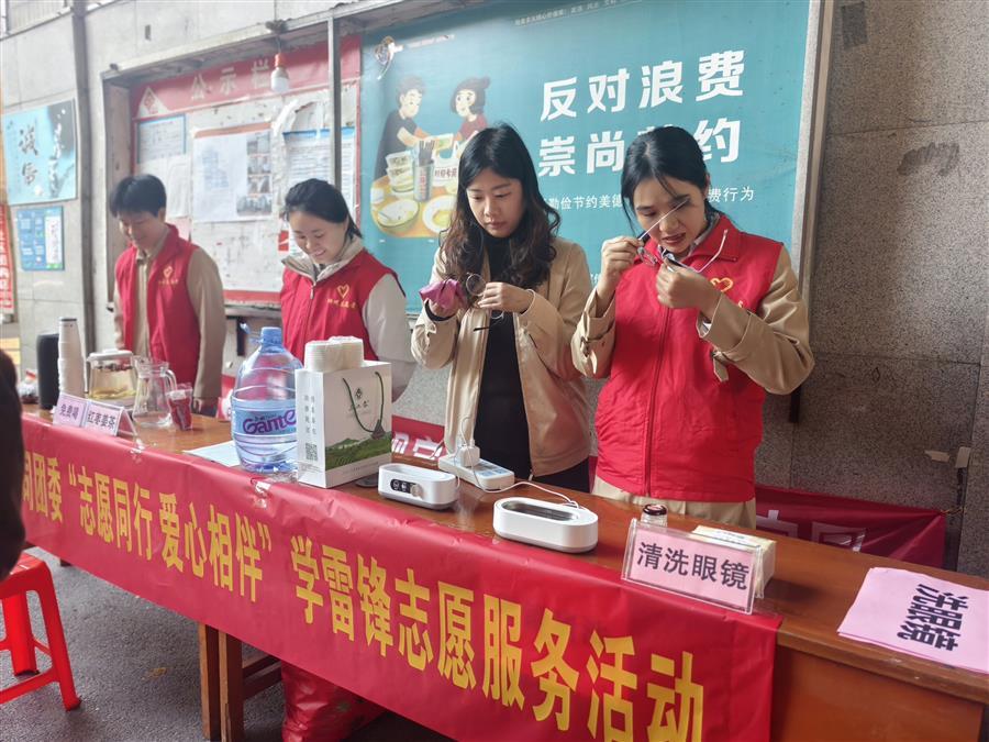 活動現(xiàn)場,志愿者們?yōu)樯鐓^(qū)居民提供清洗眼鏡、贈送紅棗姜茶、清除小廣告、防詐宣傳等志愿服務(wù),為社區(qū)居民送去溫暖與便利。