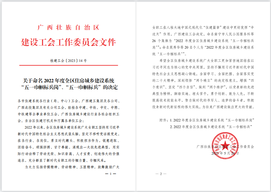 近日,廣西建設(shè)工會(huì)工作委員會(huì)下發(fā)了《關(guān)于命名2022年度全區(qū)住房城鄉(xiāng)建設(shè)系統(tǒng)“五一巾幗標(biāo)兵崗”“五一巾幗標(biāo)兵”的決定》,冶建經(jīng)營公司造價(jià)咨詢中心榮獲“五一巾幗標(biāo)兵崗”稱號(hào)。