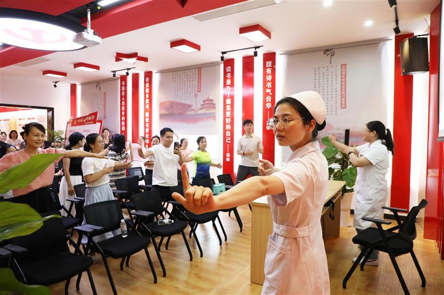 隨后,蔣芳幸醫(yī)生現(xiàn)場示范八段錦經(jīng)典動作,逐一講解要領及養(yǎng)生功效。職工們跟隨練習,在醫(yī)生指導下逐漸掌握動作規(guī)范,切身感受傳統(tǒng)功法的養(yǎng)生魅力。